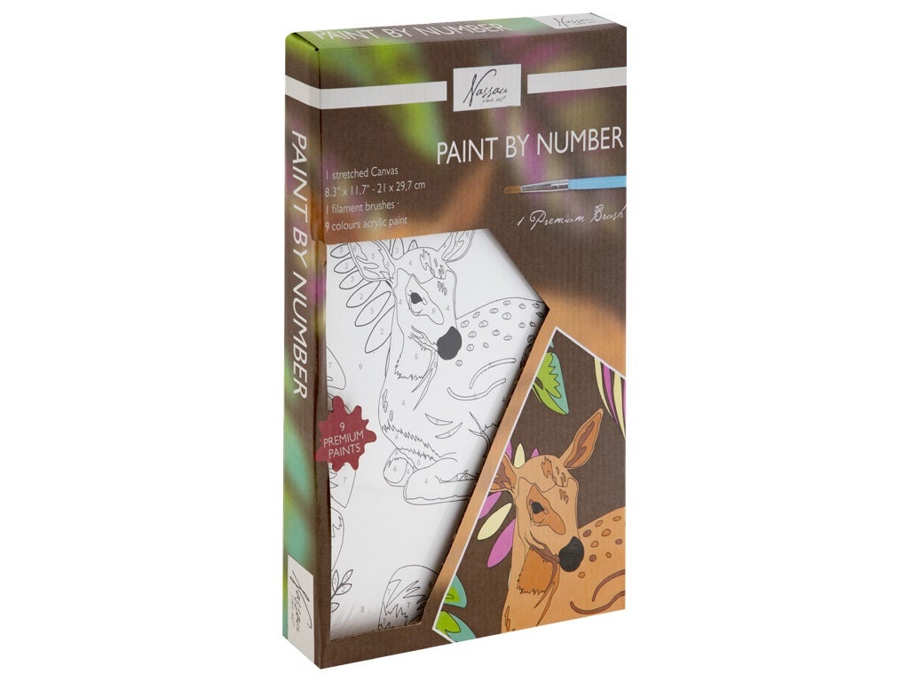 Paint by number - Maalaa numeroin. Sisältää A4 kokoisen pingotetun canvas-pohjan, siveltimen sekä 9 akryyliväriä. Kuvan alueet on numeroitu kuten myös värit. Maalaa kuvaan numeroa vastaavalla värillä.
